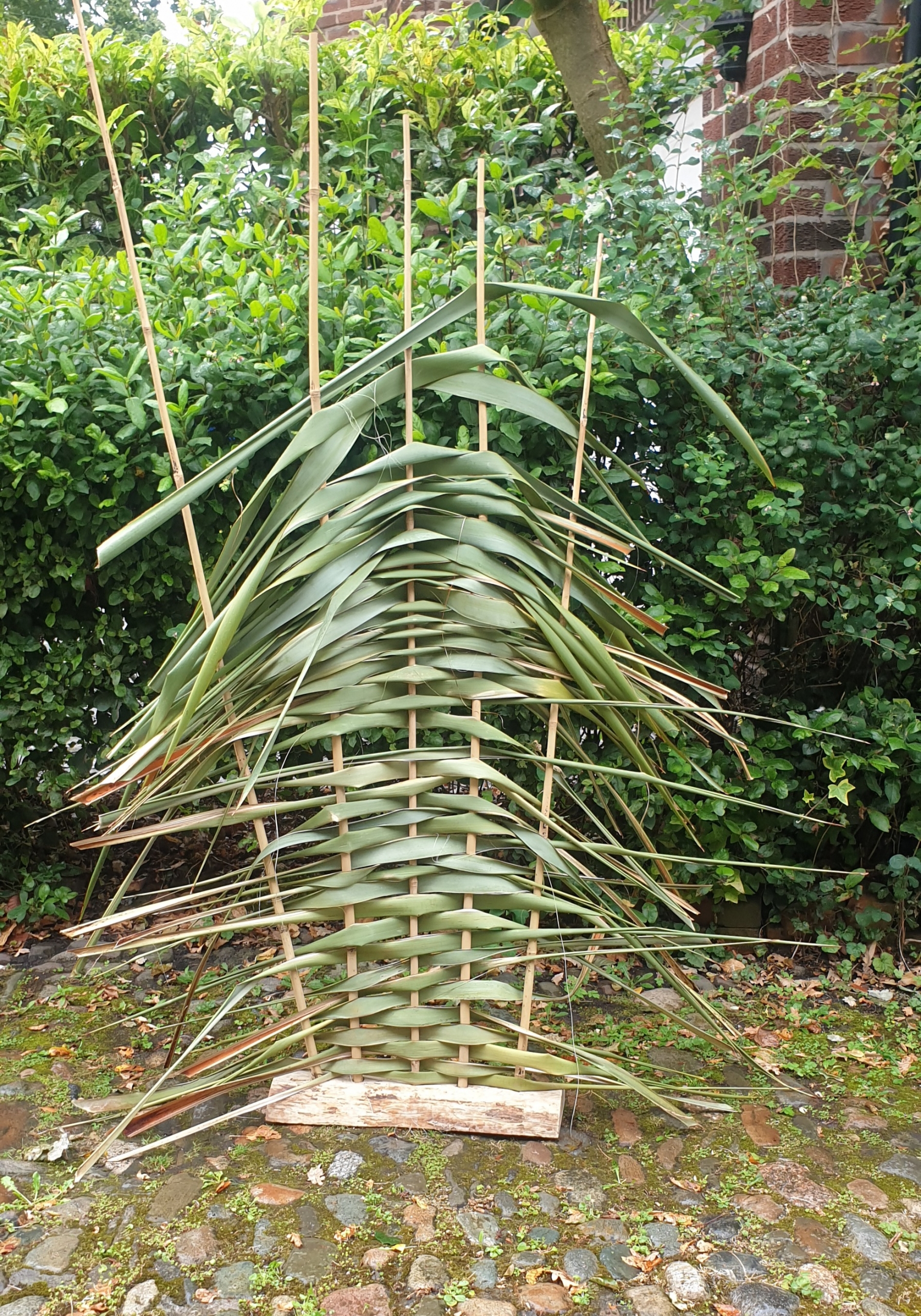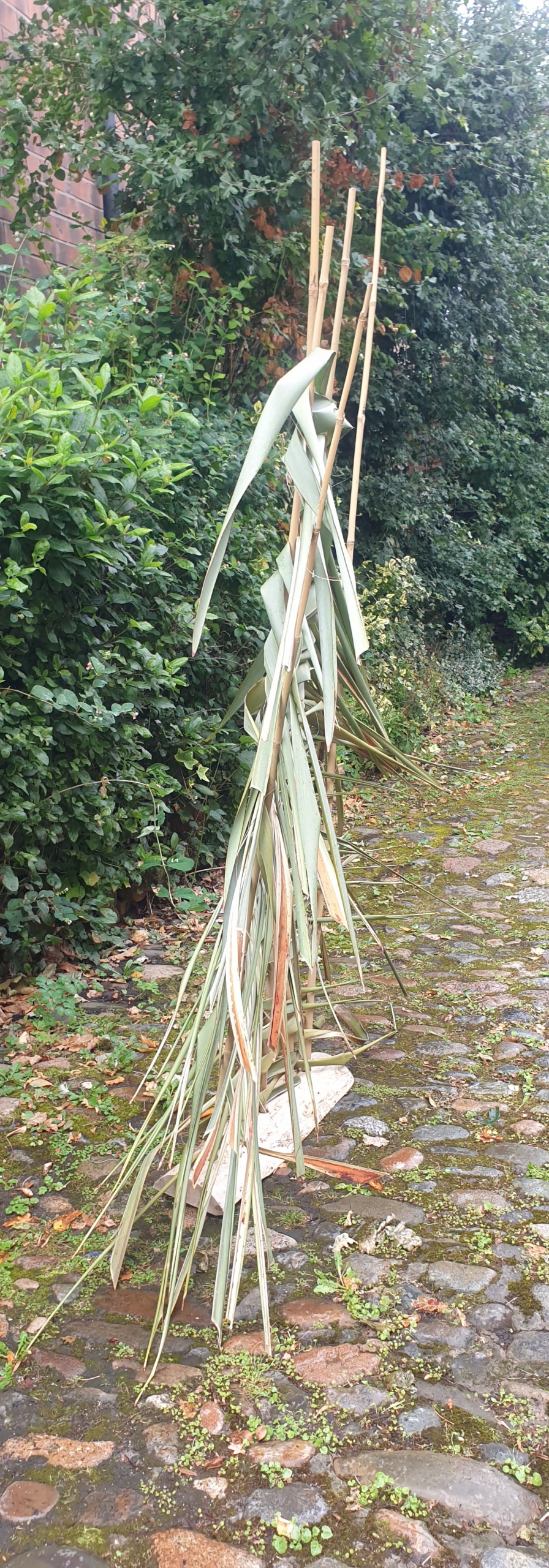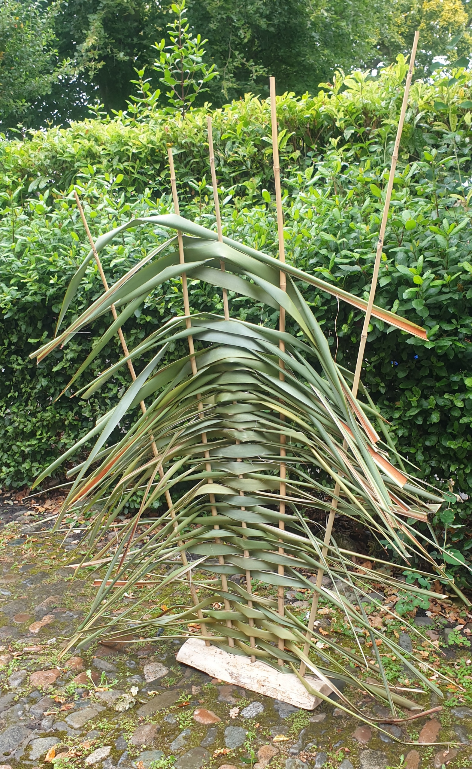 Bamboo canes set in halved branch, flax.